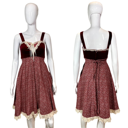 1970's Maroon Velvet & Cotton Gunne Sax Dress Size XS