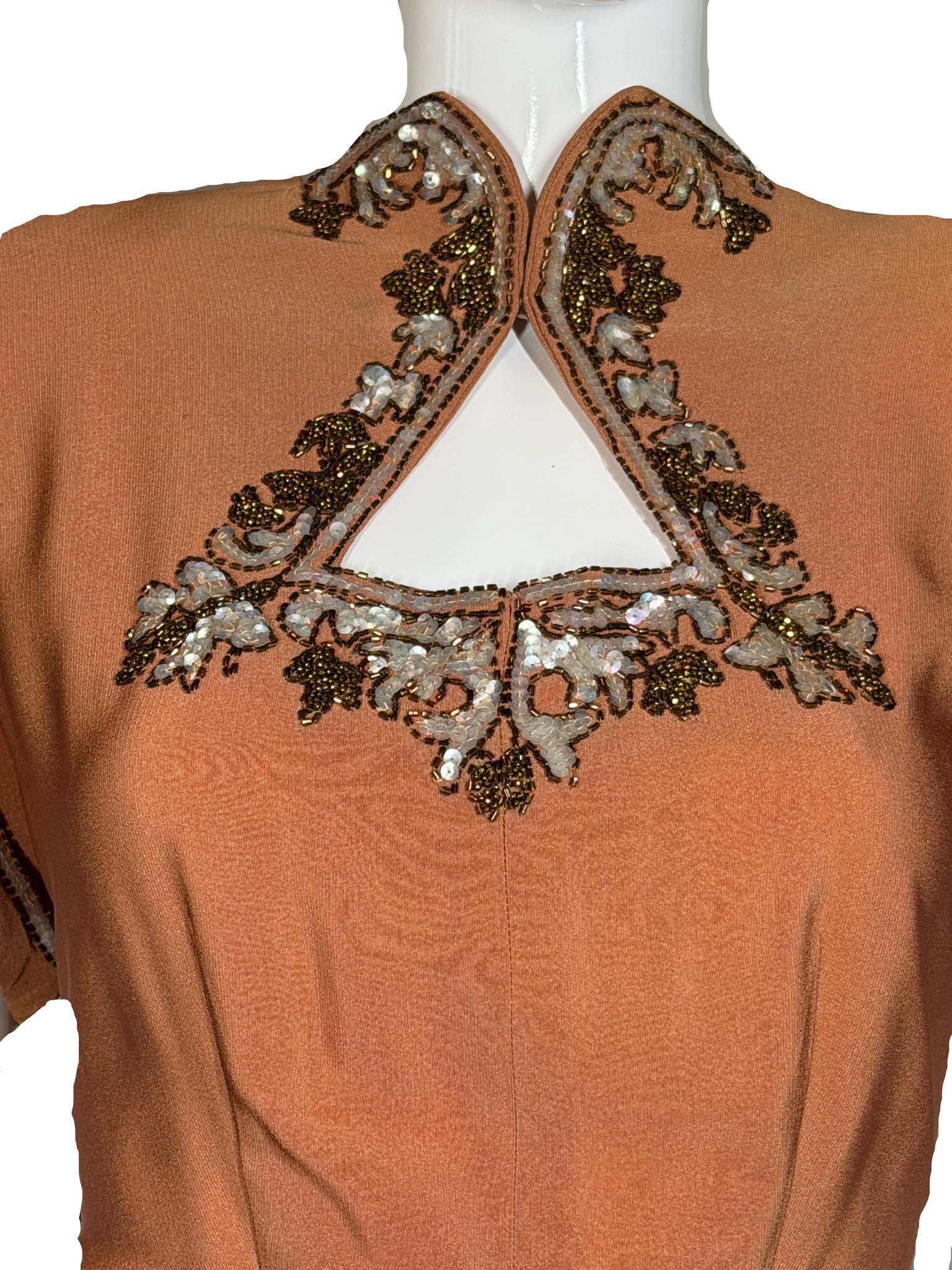 - Sequin/beading detail at neckline and sleeves