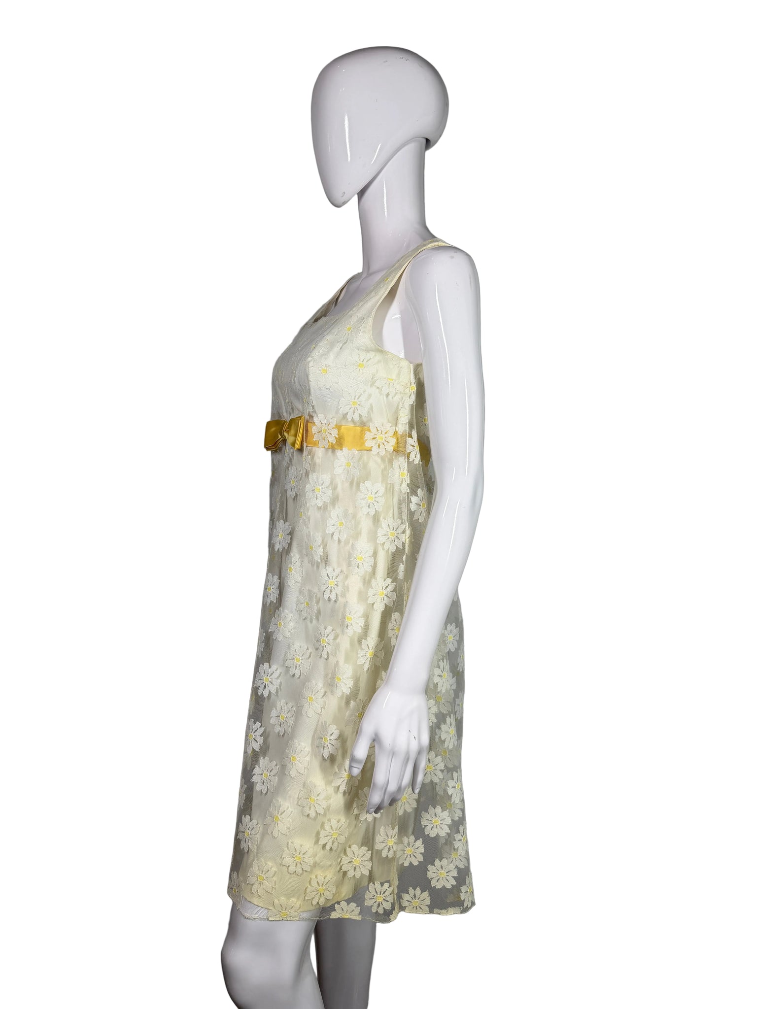 - Empire waist with a yellow satin bow